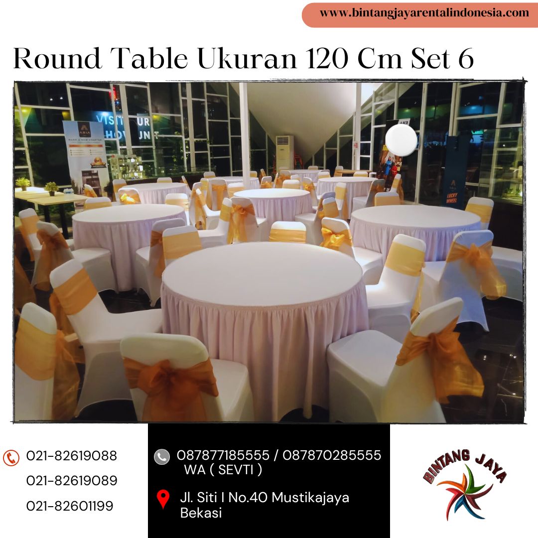 Cari Sewa Round Table Ukuran 120 Cm Set 6 Kursi Area Jakarta pusat ? atau mencari meja dengan set kursi yang sampai 10 kursi untuk acara anda dengan harga termurah ? Ya betul sekalih di bintang jaya lah solusi untuk anda yang mencari meja dengan set kursi yang banyak. kami dari bintang jaya juga siap setting dan juga siap kirim cepat dengan servis layanan antar jemput ke seluruh wilayah di jakarta dan jabodetabek dan sekitar nya.