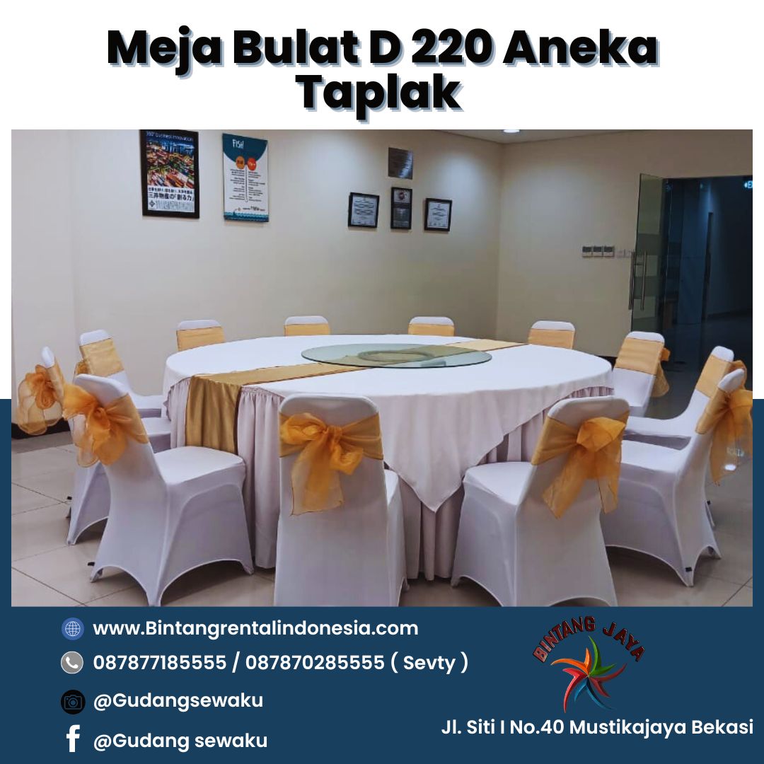 Persewaan Meja Bulat D 220 Aneka Taplak Area Karawang Kulon milik bintang jaya adalah meja bulat pesta atau event yang terlenkap dengan spesfikasi meja mutu tinggi yang siap menyukses kan semua jenis acara anda. Meja ukuran diameter 220 cm ini memuat 11 kursi di mana meja ini lebar dan juga bisa memuat piring dan juga idang dengan melimpah. Meja bulat ukuran ini siap kirim ke seluruh wilayah di karawang dan juga jabodetebek.