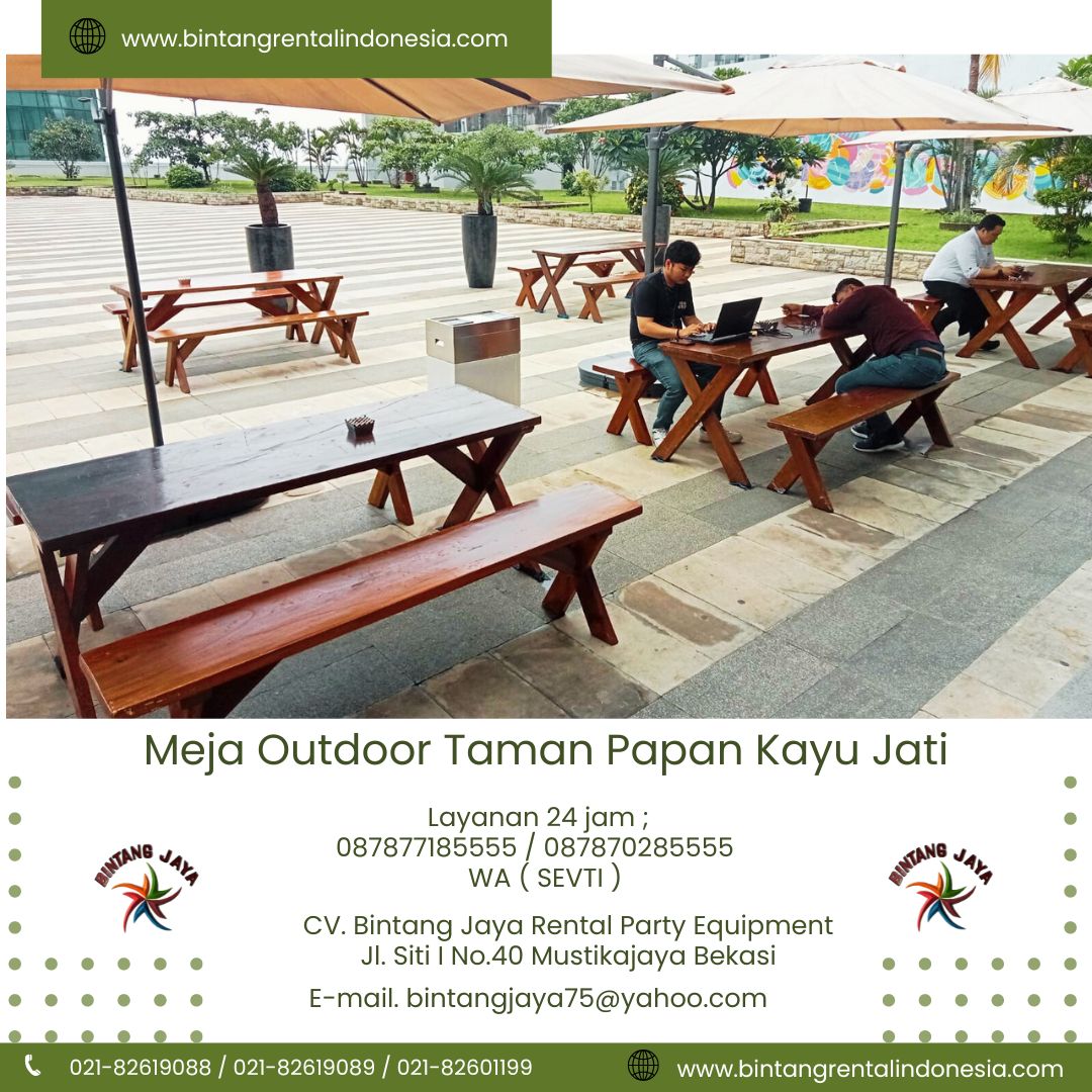 Apa anda sedang Cari Sewa Meja Outdoor Taman Papan Kayu Jati Area Tangerang ? Atau anda sedang cari meja event dengan tema event outdor menggunakan bahan kayu yang ramah lingkungan ? untuk anda yang sedang mencari meja kayu dengan kualitas tinggi dan siap set dengan jumlah yang melimpah ya hanya di kami di bintang jaya. Karena kami menyediakan meja taman kayu jati yang siap memeriahkan acara event outdoor anda dengan harga yang di jamin terjangkau.