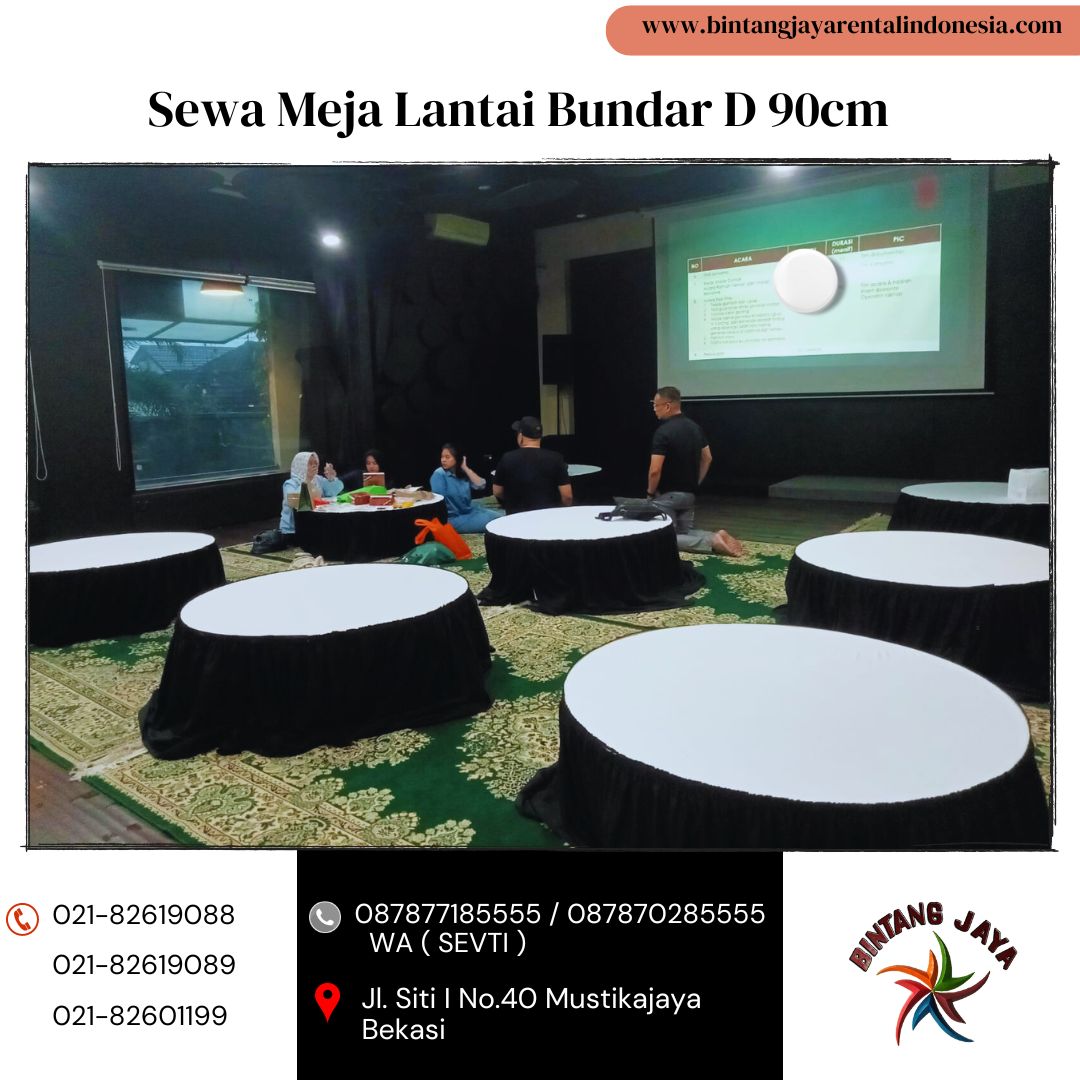 Anda Cari Sewa Meja Lantai Bundar D 90cm Area Kota Bogor yang siap setting dengan jumlah yang melimpah dengan harga termurah ? Atau anda sedang mencari meja lesehan aneka ukuran yang terlengkap di wilayah terdekat bogor dan jabodetabek ? Ya di bintang jaya lah solusi anda yang sedang mencari meja lesehan dengan aneka ukuran yang terlengkap. Bintang jaya juga siap menyukseskan segala jenis acara anda. Karena kami adalah rental party equipment terbesar di area jabodetabek.