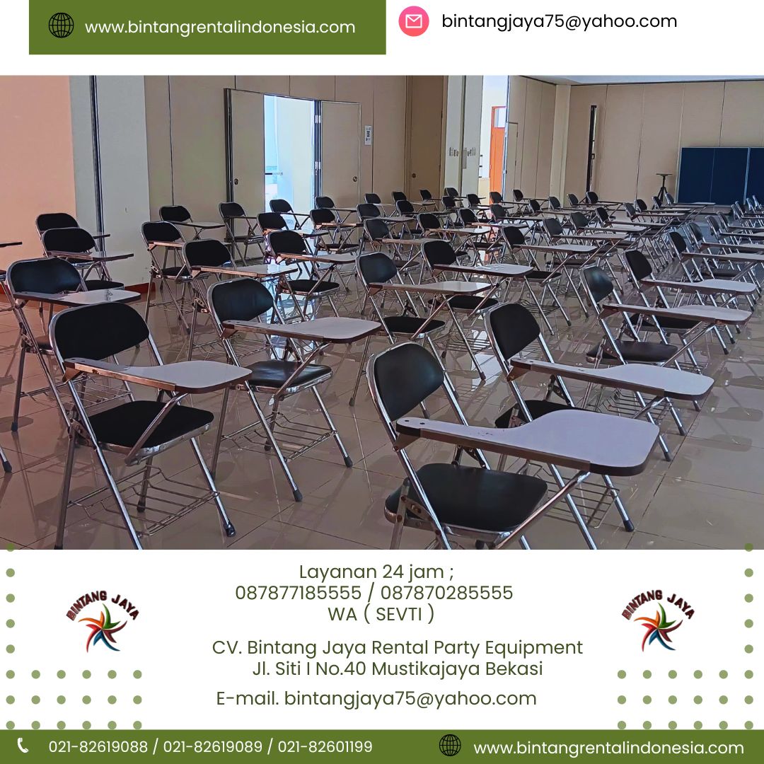 Apakah anda sedang mencari tempat Sewa Kursi Seminar Workshop Kuliah Event Jakarta dan juga di jabodetabek ? Tak perlu khawatir karena ada bintang jaya yang siap set untuk anda yang sedang membutuhkan kursi tipe kuliah. Dan bintang jaya juga siap kirim dengan cepat dan tepat waktu di seluruh wilayah di jabodetabek. Bukan hanya itu saja bintang jaya adalah rental party equipment yang terbesar dan juga terlengkap di wilayah jabodetabek.