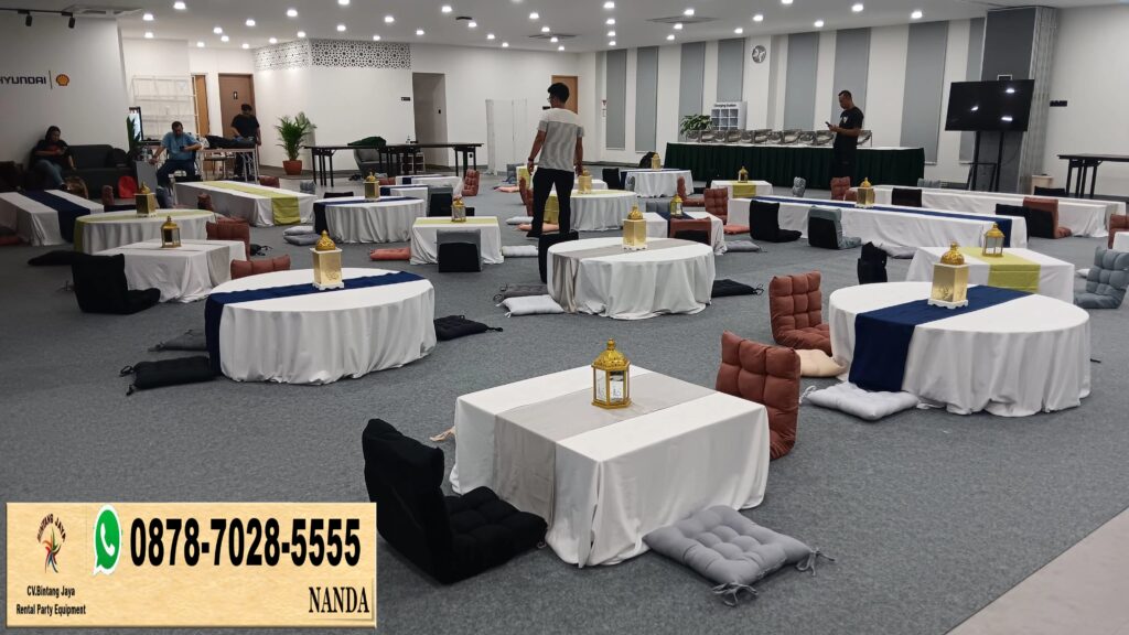 Sewa sofa lesehan plus meja lesehan kotak lengkap cover area Jakarta. Kami menyediakan berbagai pilihan sofa lesehan dan meja lesehan kotak yang dapat disesuaikan dengan tema acara anda. Dari warna yang cerah hingga desain yang elegan, anda bisa memilih sesuai dengan selera dan kebutuhan. Semua perlengkapan kami terbuat dari bahan berkualitas tinggi, sehingga awet dan nyaman digunakan.