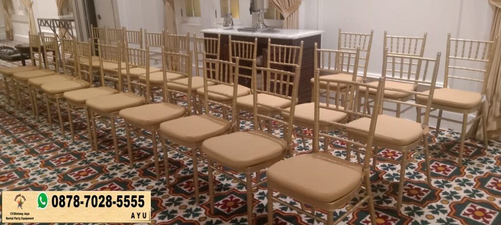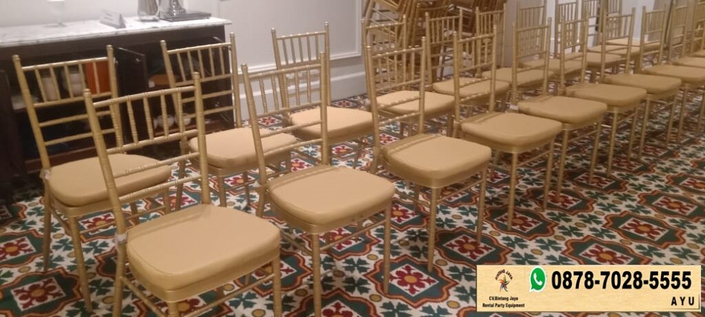 Layanan sewa kursi tiffany gold stok ready area Jakarta. Dengan kualitas yang kami tawarkan, harga sewa kursi tiffany gold kami sangat bersaing. Kami berkomitmen untuk memberikan layanan terbaik dengan harga yang terjangkau, sehingga anda dapat mengalokasikan anggaran untuk hal-hal lain yang lebih penting dalam acara anda.