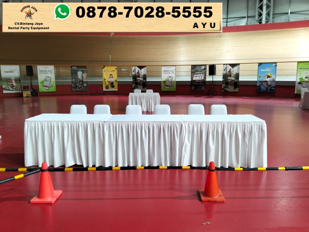 Jangan lewatkan kesempatan untuk menyewa meja kotak cover merah putih ini untuk acara anda di Tangerang. Segera hubungi penyedia jasa sewa untuk memastikan ketersediaan dan mendapatkan penawaran terbaik. Dengan hanya beberapa langkah, anda bisa membuat acara anda lebih berkesan dan meriah. Pastikan untuk memesan jauh-jauh hari agar tidak kehabisan!
