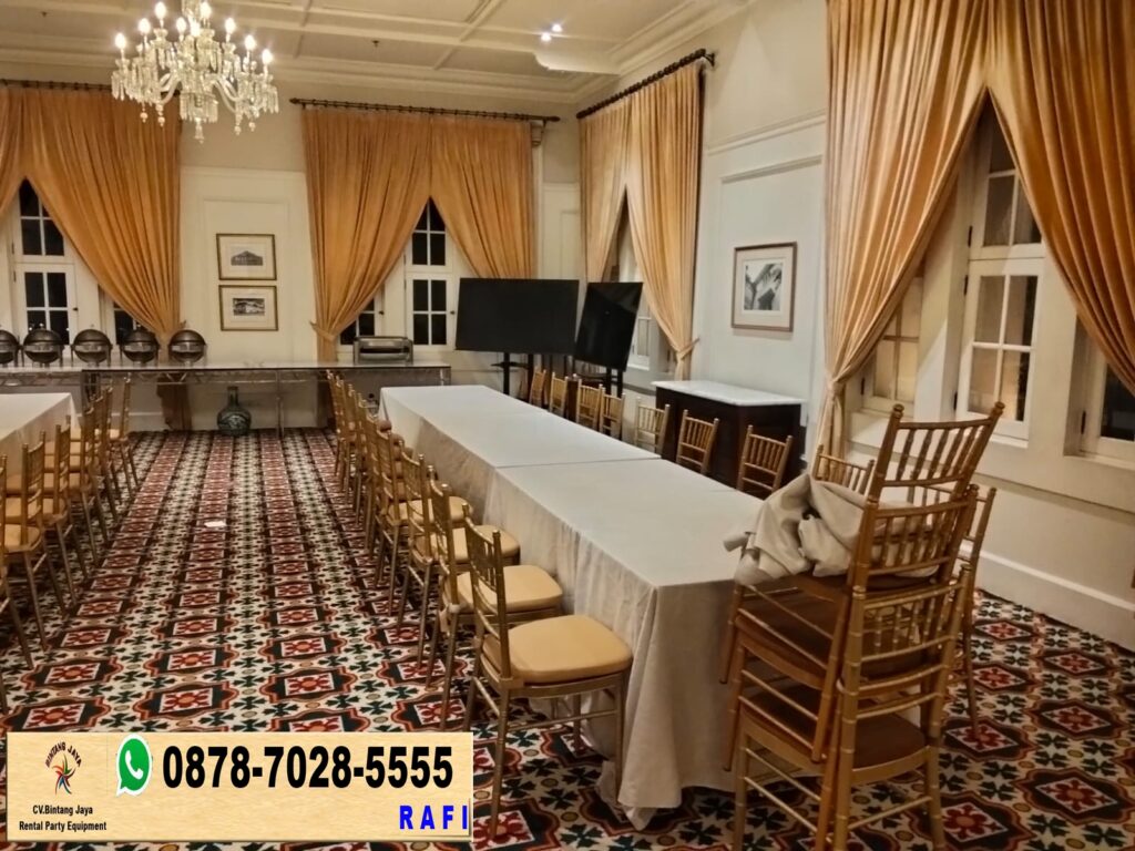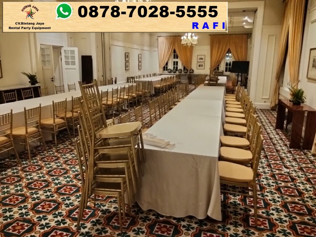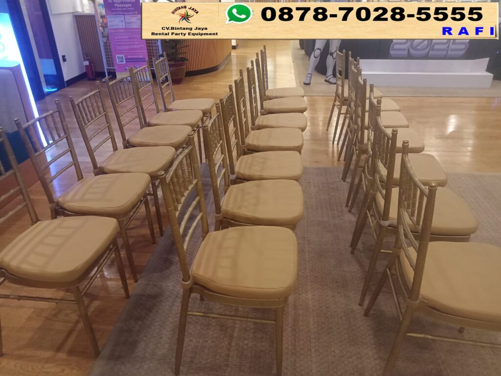 Tempat sewa kursi kayu model tiffany warna emas di Karawang. Vendor sewa alat pesta Bintang Jaya menawarkan berbagai jenis alat pesta berkualitas, mulai dari tenda, kursi, meja, hingga perlengkapan dekorasi.